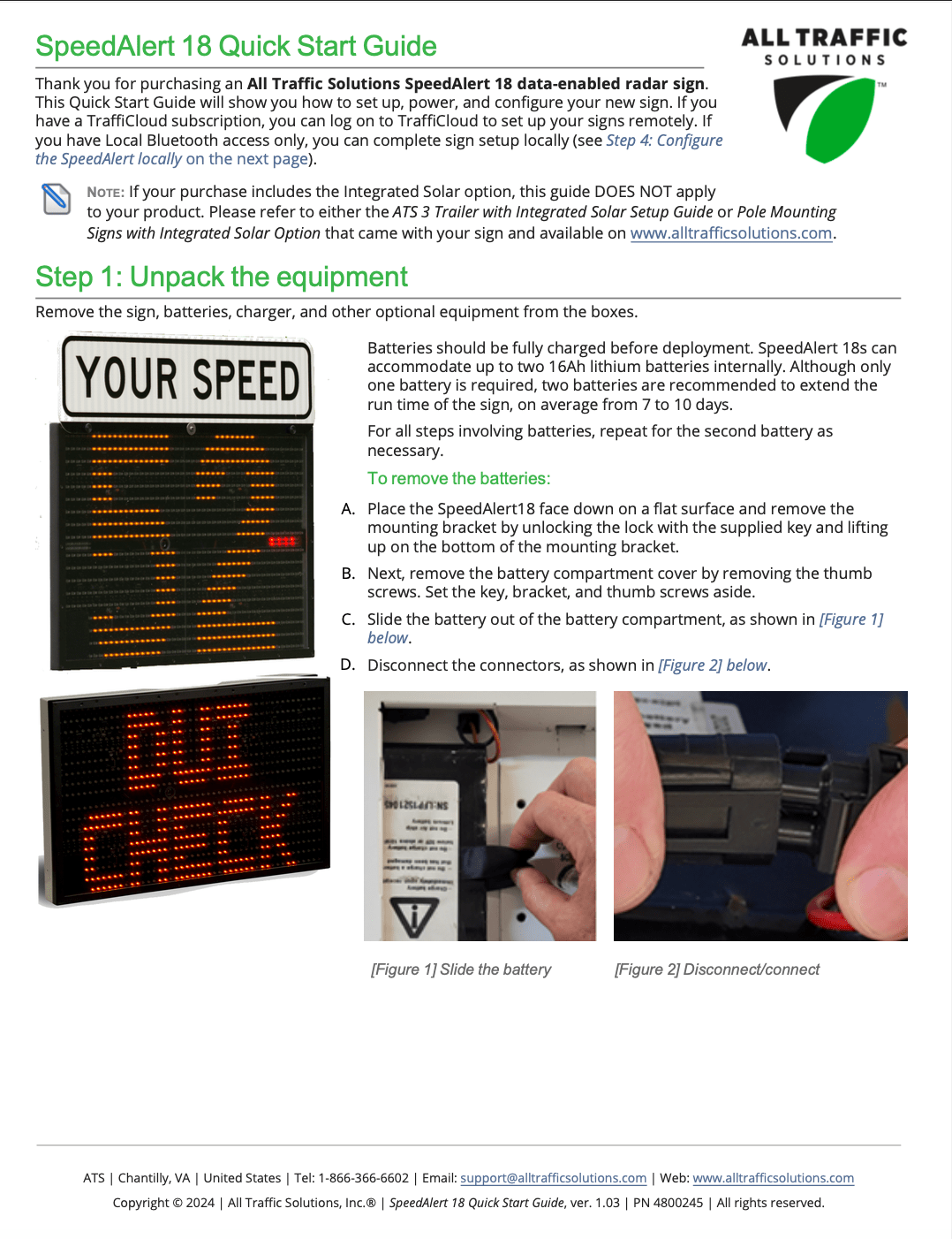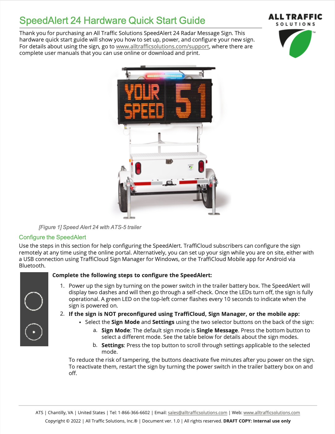 This Hardware Quick Start Guide is meant for anyone who needs to set up a SpeedAlert 18 Radar Message Sign. It provides instructions on how to power, set up, and configure your sign, including the following: