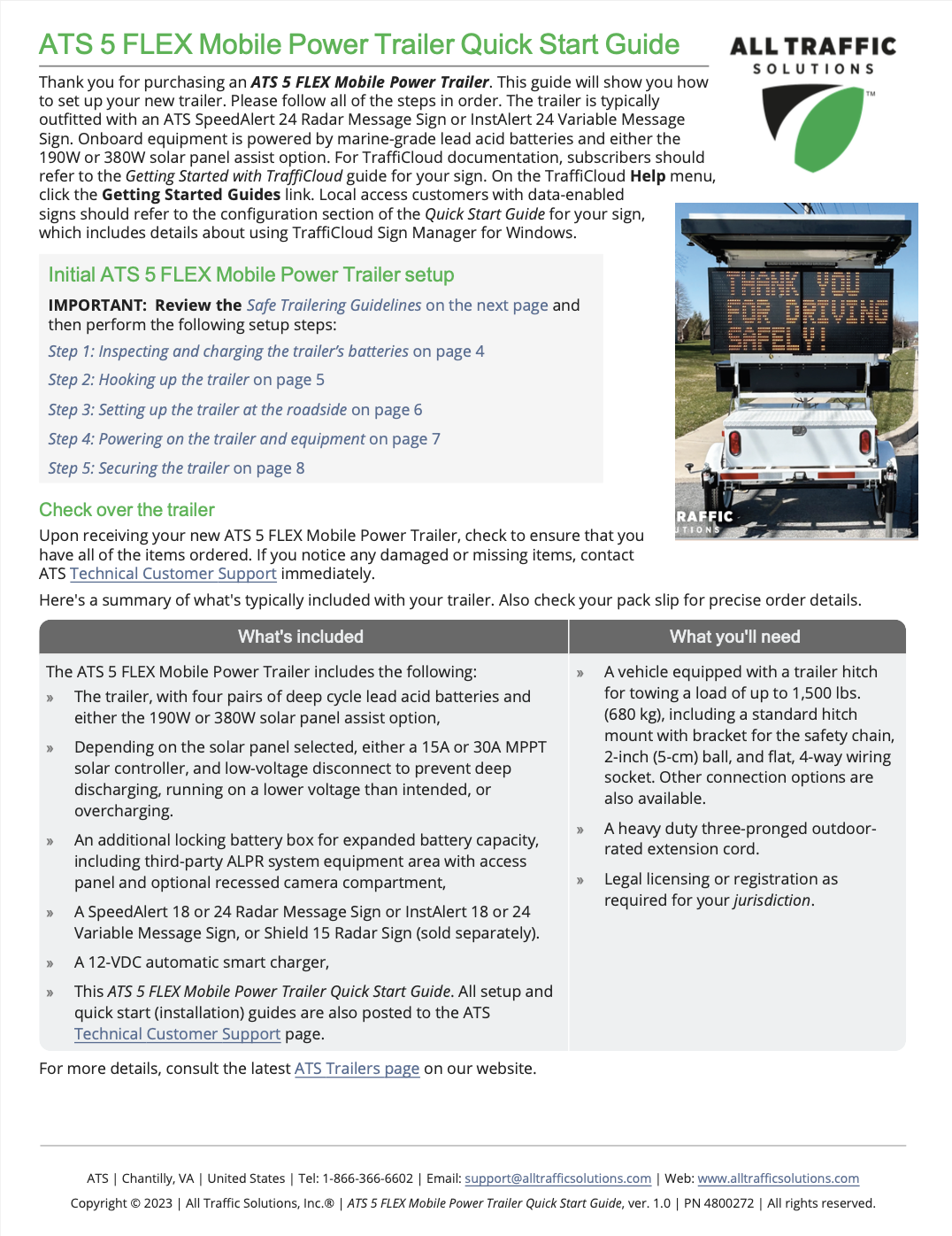 This Setup Guide is meant for anyone who needs to set up an ATS 5 FLEX Trailer. It provides the following: