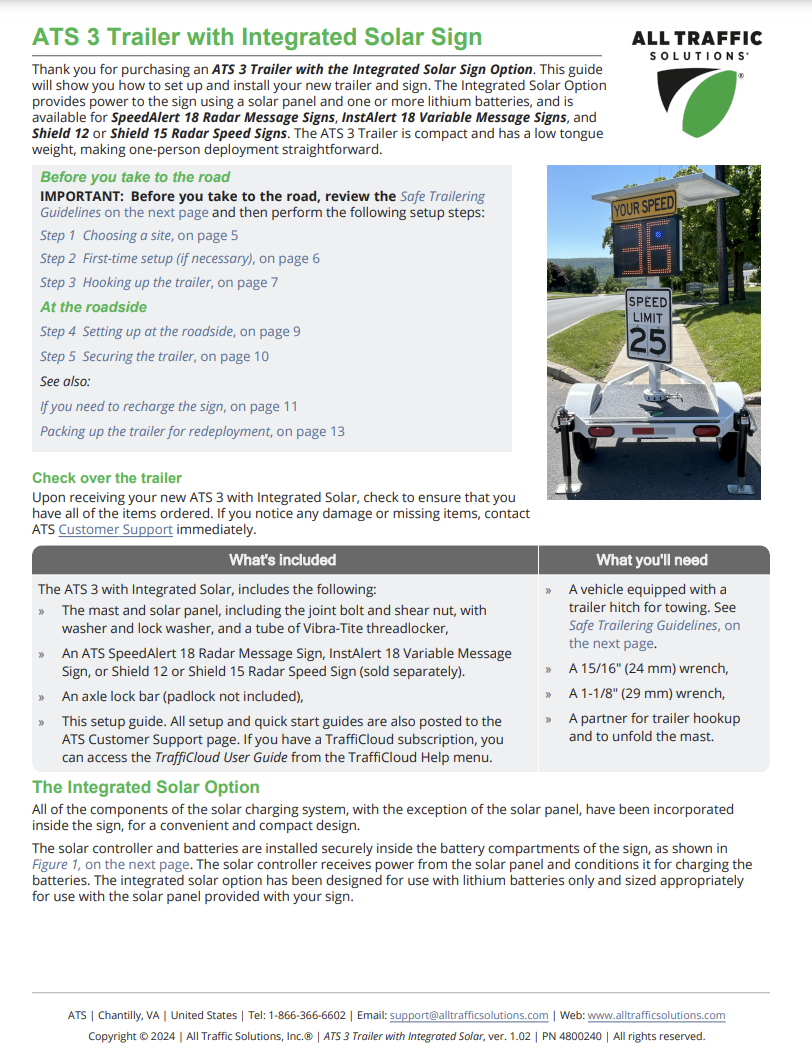 This Setup Guide is meant for anyone who needs to set up an ATS 3 Trailer with Integrated Solar. It provides the following: