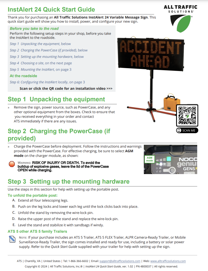 This Hardware Quick Start Guide is meant for anyone who needs to set up an InstAlert 24 Variable Message Sign. It provides instructions on how to power, set up, and configure your sign, including the following: