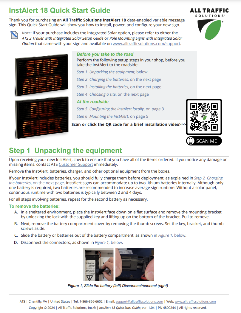 This Hardware Quick Start Guide is meant for anyone who needs to set up an InstAlert 18 Variable Message Sign. It provides instructions on how to power, set up, and configure your sign, including the following: